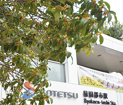 相鉄・緑園都市駅東口の街路樹、金木犀(キンモクセイ)に花が咲き、街角に香りが漂っている=写真。