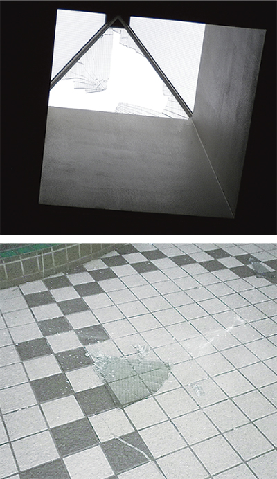 泉スポーツセンターで10月19日に破壊されたのは天窓と窓ガラス。清掃作業員が同日朝に発見し、ガラス片が天窓の下にある1階の床に散乱していた。犯人は2階から屋上へと上ったとみられ、はしご付近のフェンスには蹴り破ろうとした跡が残っていた。同センターは同日応急処置した後、ガラスを張り替え、現在は通常営業している。