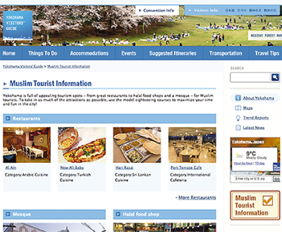 その一つが、横浜市の観光情報公式サイト(英語版)内で12月5日に開設したムスリム旅行者向けのホームページだ。市内ムスリム在住者が勧める観光情報を掲載するもので、国内では初の取り組み。イスラム教では豚食の禁止や礼拝の義務といった宗教上の規律があり、そのニーズに応えることが課題となる。食の制約を考慮した料理を提供する飲食店などを、ムスリム目線で紹介している。