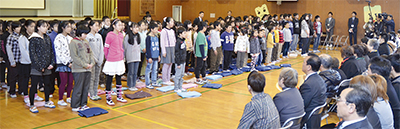 来賓や保護者らを前に述べた「お別れの言葉」では児童が思いを込めて声を振り絞り「学校がなくなってもいちょう小の思い出を忘れない。友達を大切に、夢と思いやりを持って、いちょう小ありがとう」と締め、校歌等を合唱した=写真。