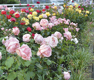 同所のバラは、下飯田町の小菅賢三さんが横浜高島屋で展覧会を開催している横浜ばら会に入会したのを機に、5年前から育てているもの。バラの数は年々増え、今では48株を数える。