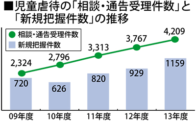 市内の児童相談所が2013年度に把握した児童虐待件数は1159件(前年度比25%増)で、過去最多だった。相談・通告の受理件数も過去最多を記録しており、前年度比442件増の4209件。こども青少年局中央児童相談所では啓発活動や関係機関との連携により察知体制が強化されたことを増加の一因にあげ、早期発見につながったとしている。