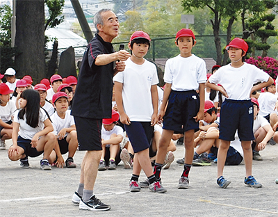マラソン選手としてメキシコ、ミュンヘン、モントリオールの五輪に3大会連続で出場した宇佐美彰朗さんが6月4日、岡津小学校(小竹護校長)の授業に参加した。