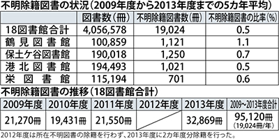 中央図書館を含めた市内18館のうち、監査対象となったのは鶴見・保土ケ谷・港北・栄の4図書館。09年から13年の5年間で不明除籍となった図書の数は9万5120冊、毎年平均で1万9024冊の図書が消えていることになる。