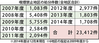 横浜市が喫煙禁止地区に指定している6地区で、指定が始まった2007年度から昨年末までの違反者に対する過料処分件数が約2万3千件に上ることが分かった。年5千件を超えていた件数は減少傾向にあるものの、依然、ゼロには近づかない状況。危機感を募らせる市では、周知の強化に乗り出している。