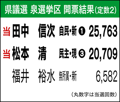 県議会議員選挙(定数2)には、松本清氏(民主現・42歳)、福井裕水氏(無所属新・61歳)、田中信次氏(自民新・35歳)の3氏が立候補。田中氏が2万5763票を獲得し初当選、松本氏は2万709票で3期目の当選を果たした。福井氏は6582票で及ばなかった。