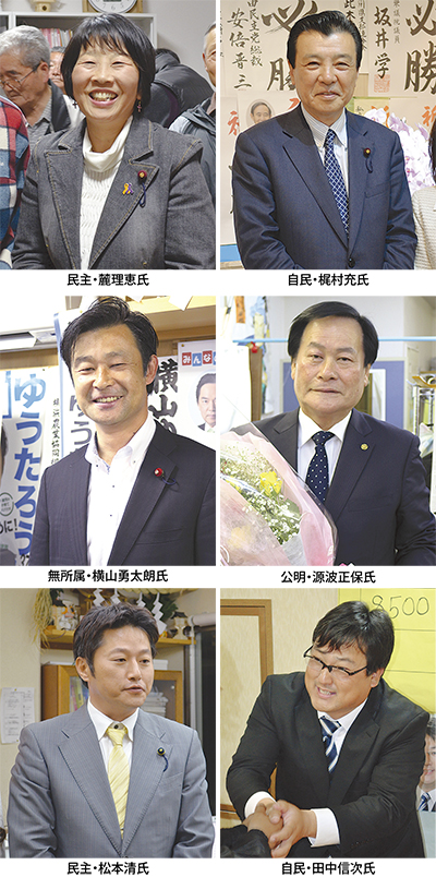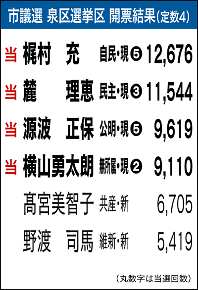 市会議員選挙(定数4)には横山勇太朗氏(無所属現・41歳)、源波正保氏(公明現・61歳)、梶村充(自民現・66歳)、高宮美智子(共産新・62歳)、麓理恵(民主現・56歳)、野渡司馬(維新新・34歳)の6氏が立候補した。トップ当選は1万2676票で梶村氏、麓氏が1万1544票、源波氏が9619票、横山氏が9110票で続いた。一方、高宮氏、野渡氏は及ばなかった。当選確定後のコメントは次の通り。