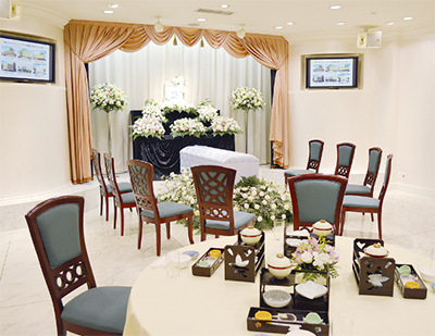 ほうさい殿は、一般葬儀から家族葬まで、各々の家族らしい葬儀を提案できるのが強み。また家族葬でも、ただこじんまりと行うだけでなく、家族と故人が出来うる限り同じ空間で過ごせるようにと、一つの会場に祭壇とお料理の席を用意。祭壇の前で食事をしながら故人を偲ぶ「家族葬」ならではの心温まるセレモニースタイルを提案している。スタッフは「ほうさい殿の家族葬は、どのような想いにもお応えします」と話す。