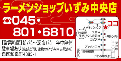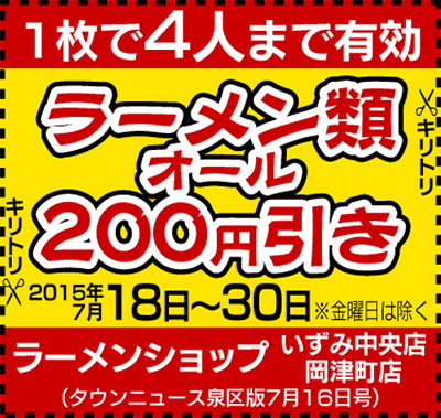 赤い看板でお馴染みのラーメンショップいずみ中央店・岡津町店では、7月18日(土)から30日(木)まで本紙クーポン持参でラーメン類がオール200円引きになるキャンペーンを開催する。