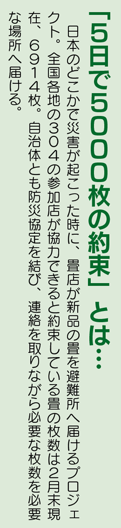 届ける畳はすべて新品と決まっている。厚みがあるため、体育館などの硬く冷たい床の上でも冬は暖かく、夏は涼しさを感じることができるのが長所。日本人が慣れ親しんだ畳の感触やイ草の香りは、被災者の心の癒しにもつながると期待されている。これまでにも豪雨や噴火により開設された避難所へ、近隣の参加店が畳を届けてきた。「いつなにが起こるかわからない。自分たちが動ける状況であれば、すぐに駆けつける」と森下代表は話す。