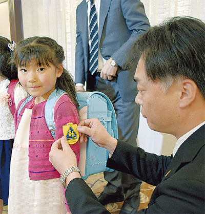 市内の交通安全団体関係者を前に、明治安田生命保険の金山毅横浜支社長は、「この事業は今年で52回目。皆様のおかげでここまで続けることができた。子どもたちの健全育成にお役に立てれば」とあいさつし、新一年生の腕にワッペンをつけた。