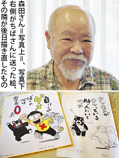 「横浜からは遠いし年寄りで力仕事はできない。だけど絵は描ける」――。熊本県のPRキャラクター・くまモンを描くと、「クマモンがクマっている」と生業のギャグを添え、仲間のちばてつやさんへ送った。2人の間でよく交わされるやりとりのつもりで、きちんと確認をせず描いたくまモン。ちばさんが自身のブログで公開すると、森川ジョージさんがくまモンの絵で熊本を励まそうと漫画家に呼びかけ。「くまモン頑張れ絵」としてツイッターを中心に、たちまち全国に広まった。「後日、著作権表示をつけて描き直した」と森田さんは照れ笑う。これらの予想外の広がりに熊本県は、イラスト利用の特例措置を出している。「苦しい時こそ笑いが必要」。いつも心にある思いだ。くまモンを描いた背景に、戦後の満州引き揚げ体験がある。ちばさんも同じ境遇だ。「大変な時期はこれからだと思う」。戦後復興したかつての日本と重ねる。挫折しそうな中で、伝えたいのは「負けないで」ということ。「自然には敵わないかもしれない。でも負けないよう助け合ってほしい」。似た心境を味わったから、できる支援がある。5月5日には自粛をしていたくまモンが活動を再開。「皆笑っていた。笑いは希望。負けないために、日常にはやはり笑いが必要」
