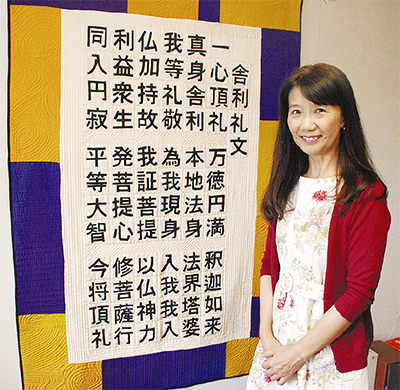 戸塚区上矢部町在住の諸星流美子さん(57)はこのほど、釈迦の遺骨を礼拝する舎利礼文の文言を縫い込んだキルトを完成させた。
