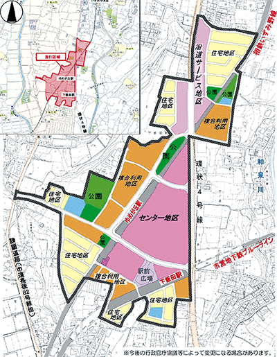 素案では、建築物の用途や容積率、建ぺい率等を定めた用途地域の変更などとともに、地区区分ごとの建築物に関する制限などが公表されている。また、駅前のセンター地区では一定条件を満たすことで31m以下の高さの建築物を建てることができると記載されており、同組合では「同地区は街のにぎわいや交流をはぐくむ市街地の中心とすべく、商業施設等を含む大規模な集客施設を想定している」と話している。北部の環状4号線沿いの沿道サービス地区は、ロードサイド型店舗や店舗併用の集合住宅等の建設が想定されているという。