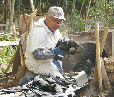 新橋炭焼きの会(丹羽猛リーダー)がつくる竹炭の窯出しが5月18日、弊紙コーナー「空から見てみよう」で登場している新橋町の中丸定昭さん宅で行われた。