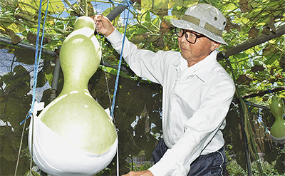 50代のころから栽培を始めた。「くびれの魅力に惹かれてね」。約30年の間、毎年、種まきや畑の土づくりから収穫に至るまで、すべて自分で行ってきた。自宅には自慢の作品がずらりと並ぶ。収穫後、中身を取り出した後は漆を塗ったり絵を描いたり、彫刻まで手掛けながら世界で一つの作品を生み出す。技術は書籍などから独学で学んだ。
