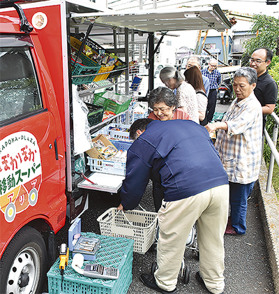 高齢者らの買い物支援のために下和泉地域に6月中旬から、移動販売車が来るようになった。これは下和泉地域ケアプラザがコーディネート。毎週水曜午後1時半から2時ころまで、同所の隣にあるグループホーム「なでしこ」の駐車場で販売が行われている。