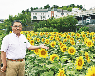 岡津町にある児童養護施設「杜の郷」(櫻井和典施設長)のヒマワリ畑。今年も満開時には、周辺住民らの目を楽しませた=写真(8月4日撮影・左は櫻井施設長)。