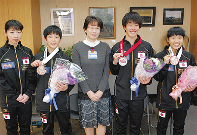 市川莞大君(泉が丘中3年)、市川洋輔君(同1年)、島津友愛さん(いずみ野中1年)の3人が今年8月に米・サンディエゴで開かれたヒップホップダンスの世界大会でメダルを獲得。11月24日に区役所を訪れ、額田区長に結果を報告した。