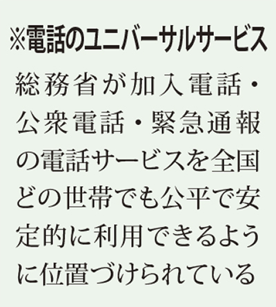 総務省は、電話のユニバーサルサービスは「あまねく日本全国に提供が確保されるべき」として、公衆電話について、市街地で500メートル四方に一台、それ以外の地域では1キロ四方に一台という基準を設けている。これにより、NTT東日本、NTT西日本は屋外で24時間誰でも使用できる場所に公衆電話の設置を進めている。