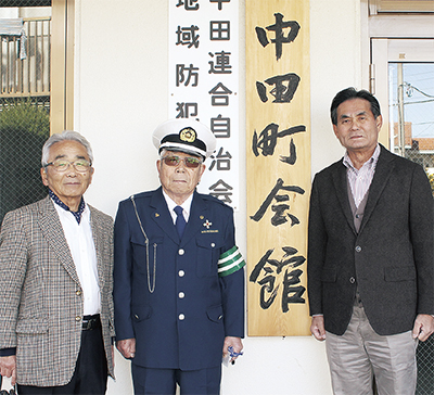 中田連合自治会がこのほど、昨年の創立50周年にあわせて約20年利用されてきた中田町会館の看板をリニューアルした。行書体で書かれた看板は同地区在住の書道家・清水六穂さん(本名清水眞司さん)が筆を入れた。