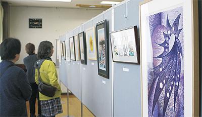 センター内に展示された作品は、切り絵や水墨画、版画、仏像彫刻や茶道、陶芸、書画など。羊毛フェルト人形やお抹茶の体験コーナー、ペン字のデモンストレーションも設けられた。