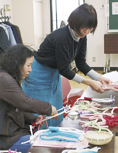 参加者は綿100%の柔らかいカラフルな生地をのばしてひも状にし、ビニール紐に巻き付けて、約2時間かけて完成させた。「履きやすそうで嬉しい」と和気あいあいと楽しんだ。