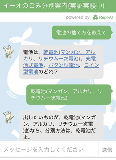 利用者が質問を入力すると同局のイメージキャラクター「イーオ」が会話調で回答。例えば「電池の捨て方を教えて」と質問を入力すると「電池は乾電池、充電式電池、ボタン型電池、コイン型電池のどれ?」と返事が来る。自分が捨てたい電池の種類を選択すると捨て方を知ることができる。