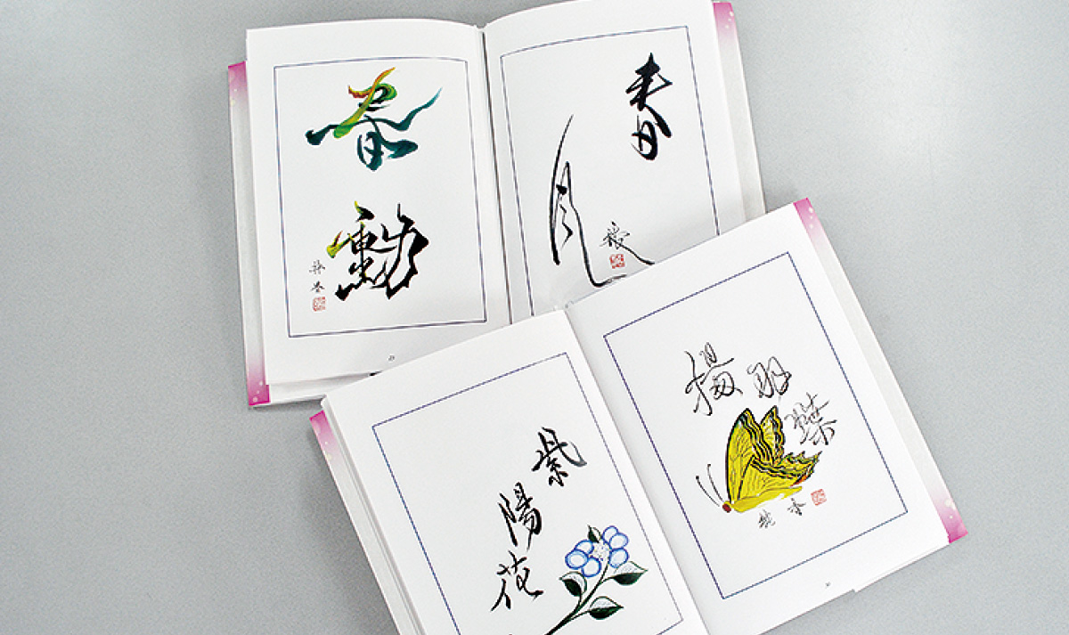 作品集は自身にとって3冊目。ここ数年書き溜めた50点がA5版の本に収録されている。『春動』と記した作品は、「春に、野山の緑が動き出すエネルギーのようなものを表現した」といい、黒や赤、緑といった強烈な色と文字線の動きが印象的だ。このほか、『揚羽蝶』、『鶴』、『寒椿』『宝船』など色鮮やかな作品が並んでいる。