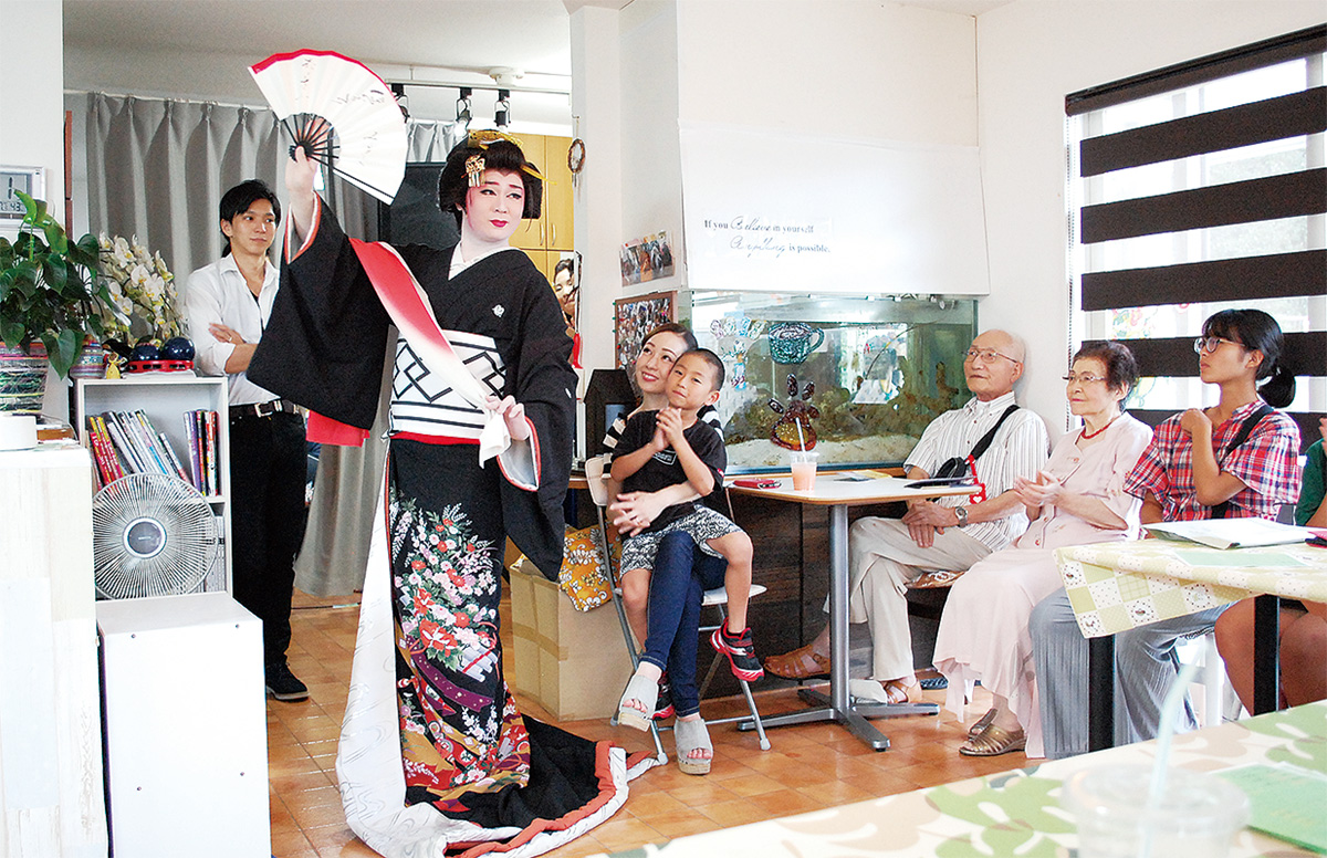 この日はフラダンスや歌、ウクレレ演奏が披露され、大人から子どもまで楽しんだ。今回の目玉は大衆演劇とハワイアン音楽のコラボレーションステージ。「今までにない面白いことをやりたい」というオーナー夫婦の想いで企画。「歌踊演舞一座響ファミリー」座長の響彬斗さんが艶やかな舞いを披露した。途中ウクレレ演奏にあわせて踊る場面では、観客たちの掛け声が飛び交った。