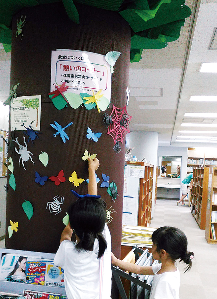 立場地区センターのロビーに出現した「樹」にこの夏、たくさんの昆虫が集まり、訪れる人たちの目を楽しませている。夏休みで子どもの来館者が増えるのに合わせ、同館スタッフが企画した参加型の工作ものだ。