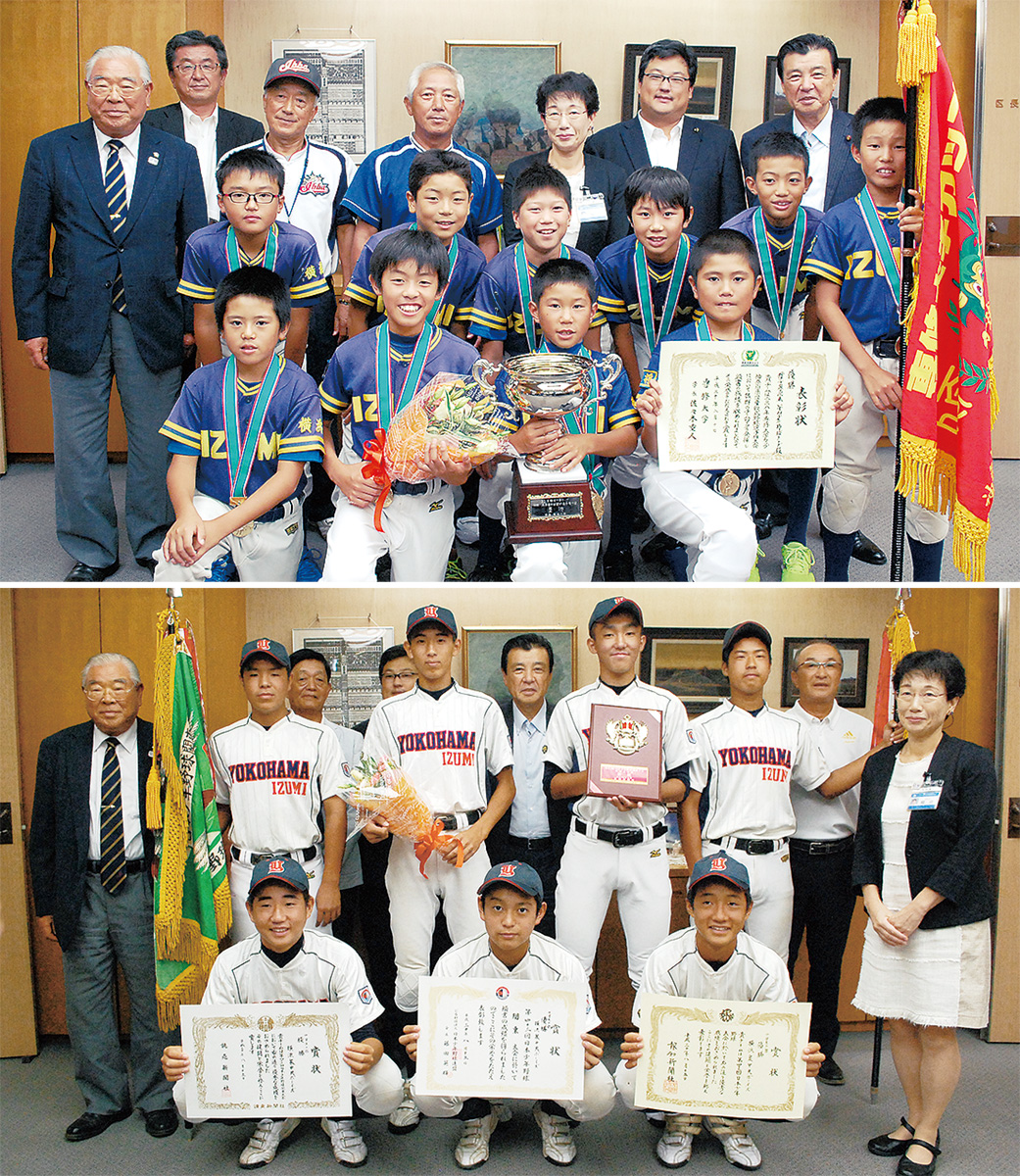 区内で活動する中学生硬式野球の「横浜泉中央ボーイズ」と小学生軟式野球の「いずみ少年野球クラブ」の選手らが8月24日、区役所を訪れ、額田樹子区長にそれぞれ今夏の大会で収めた好成績を報告した。
