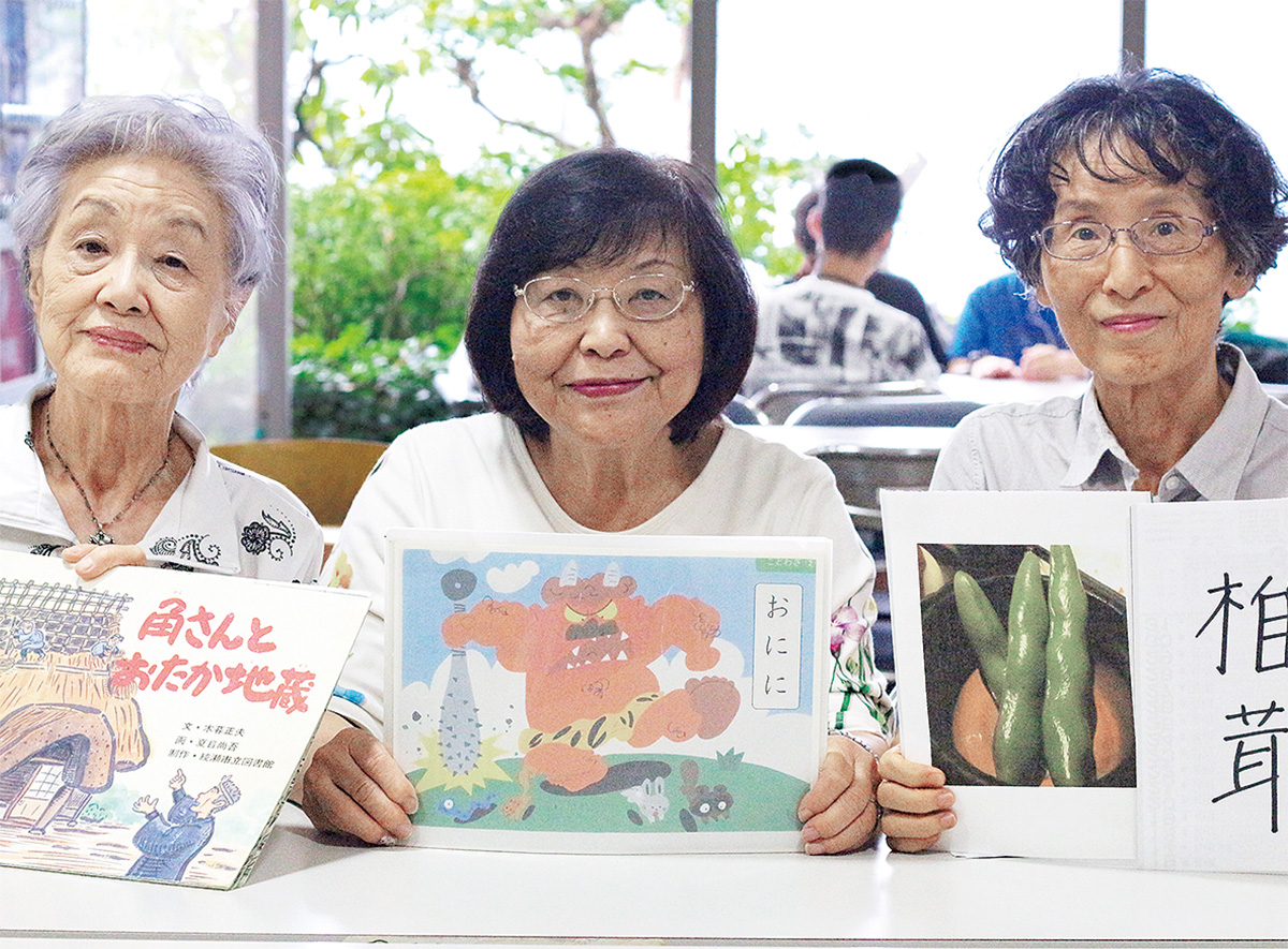 区社協から区内施設等で対面朗読の要望が多いことを聞き、2007年に本格始動した「ひだまり」。現在施設担当制で、28人のメンバーが毎月のべ22カ所に出向いている。朗読はもちろん、手遊びやゲーム、漢字や四字熟語といった脳トレまで、場に合わせた出し物を選択し、30分〜1時間程度の楽しいレクタイムを届けている。