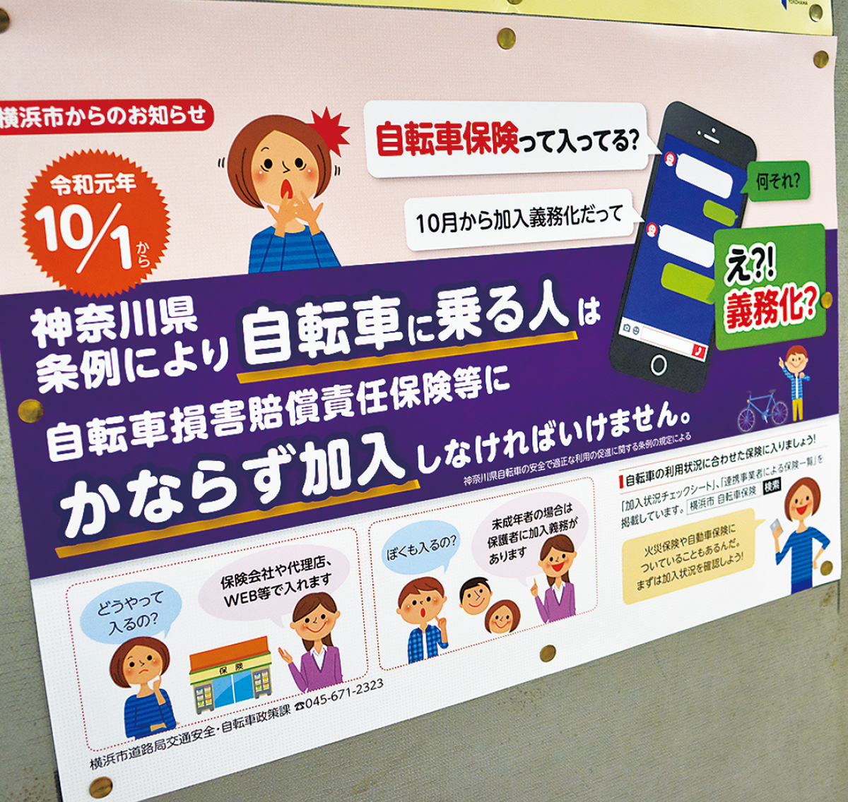横浜市は市交通安全協会などと連携し、自転車の安全利用に向けて県の条例制定前から啓発を行ってきた。市道路局交通安全・自転車政策課では、ホームページや公共交通機関、自治会町内会を通して周知。しかし2017年のアンケートによると加入率は約半数にとどまっている。同課の担当者は「保険が役立つのは万が一の時なので、必要性を感じづらいのかもしれない」と話す。
