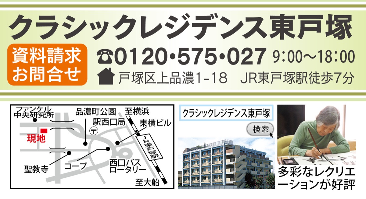 全国32法人を展開する湖山医療福祉グループで地域で15年の実績と信頼を持つ(社福)草加福祉会運営の介護付有料老人ホーム「クラシックレジデンス東戸塚」。JR東戸塚駅より徒歩7分。緑園都市駅からJR東戸塚駅への直通バスがあり、相鉄沿線からの入居者も多い。駅近のため自分で外出できる方からも人気。建物内の中庭は屋上まで吹き抜けがあり、各フロアの共用部分にもゆとりが。入居金0円と利用しやすい上、医療サービスでは、胃ろうや在宅酸素等にも対応。またプロの料理人が手掛ける食事は「予想を遥かに超える美味しさ」と好評。