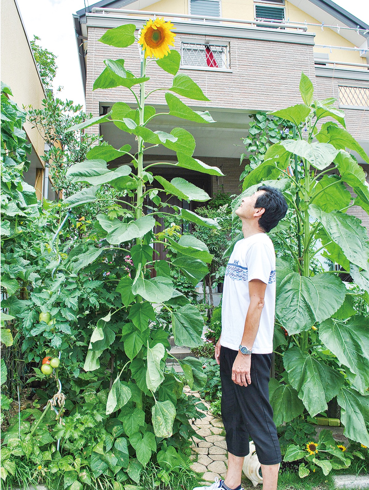 「ご近所さんや、道行く子ども達が毎年楽しみにしてくれているのが嬉しくて」と土屋さん。ヒマワリの育成を始めたのは5年前から。元々大きく育つ「ロシア」という品種だが、ここまで成長したのは今年が初めて。こだわりの自家製有機肥料で丁寧に土づくりを行うのが巨大化の秘密だ。