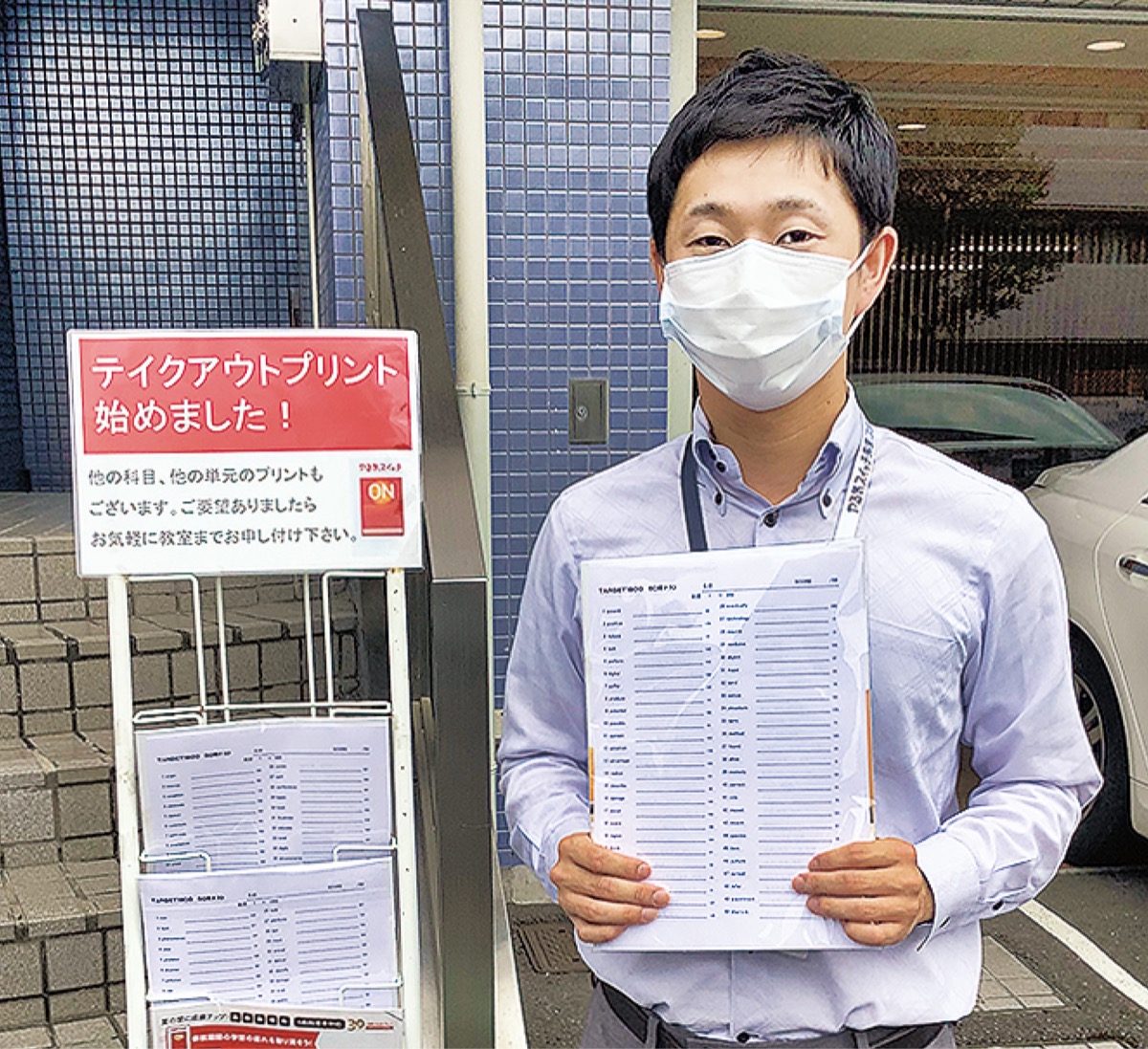 緑園7丁目の個別指導塾「スクールIE緑園都市校」では5月の大型連休明けから「テイクアウトプリント」と銘打ち、建物前にラックを置いて問題プリントを配布している。