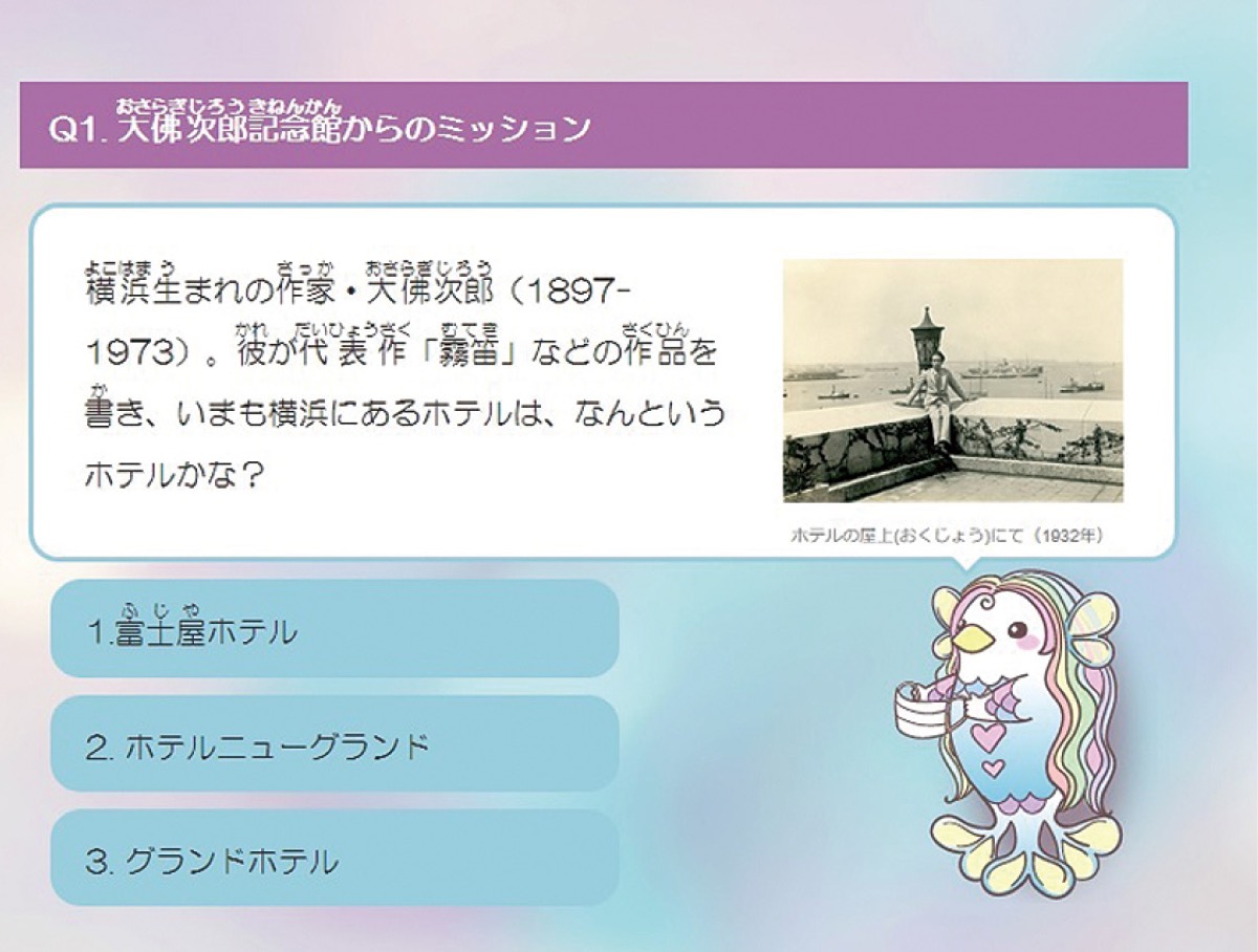 参加施設は大佛次郎記念館、神奈川近代文学館、県立歴史博物館、JICA横浜海外移住資料館、シルク博物館、ニュースパーク、野毛山動物園、放送ライブラリー、三菱みなとみらい技術館、横浜人形の家。特設サイトで各館に関係するクイズに答えて、楽しみながら知識を深めようというもの。大佛次郎が『霧笛』を書いたホテルを当てる内容など横浜の歴史に関わる問題も。
