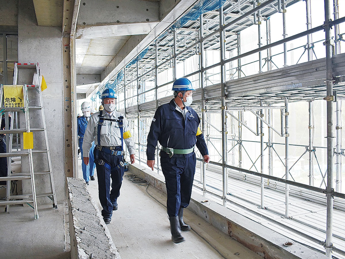 その後は現場の所長の先導で、建設中の校舎内を視察。足場を組んでの作業の様子や作業道具の保管状況などをチェックした。