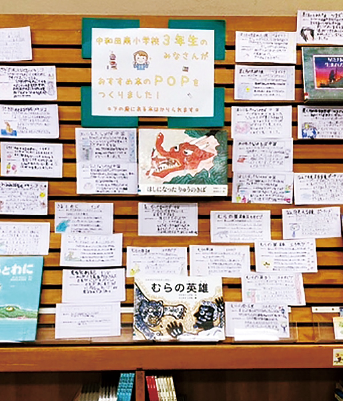中和田南小学校の児童がおすすめの絵本を販促カード(ポップ)形式で紹介する展示が、泉図書館(和泉町6207の5)の児童書展示コーナーで開かれている。期間は2月14日(日)まで。