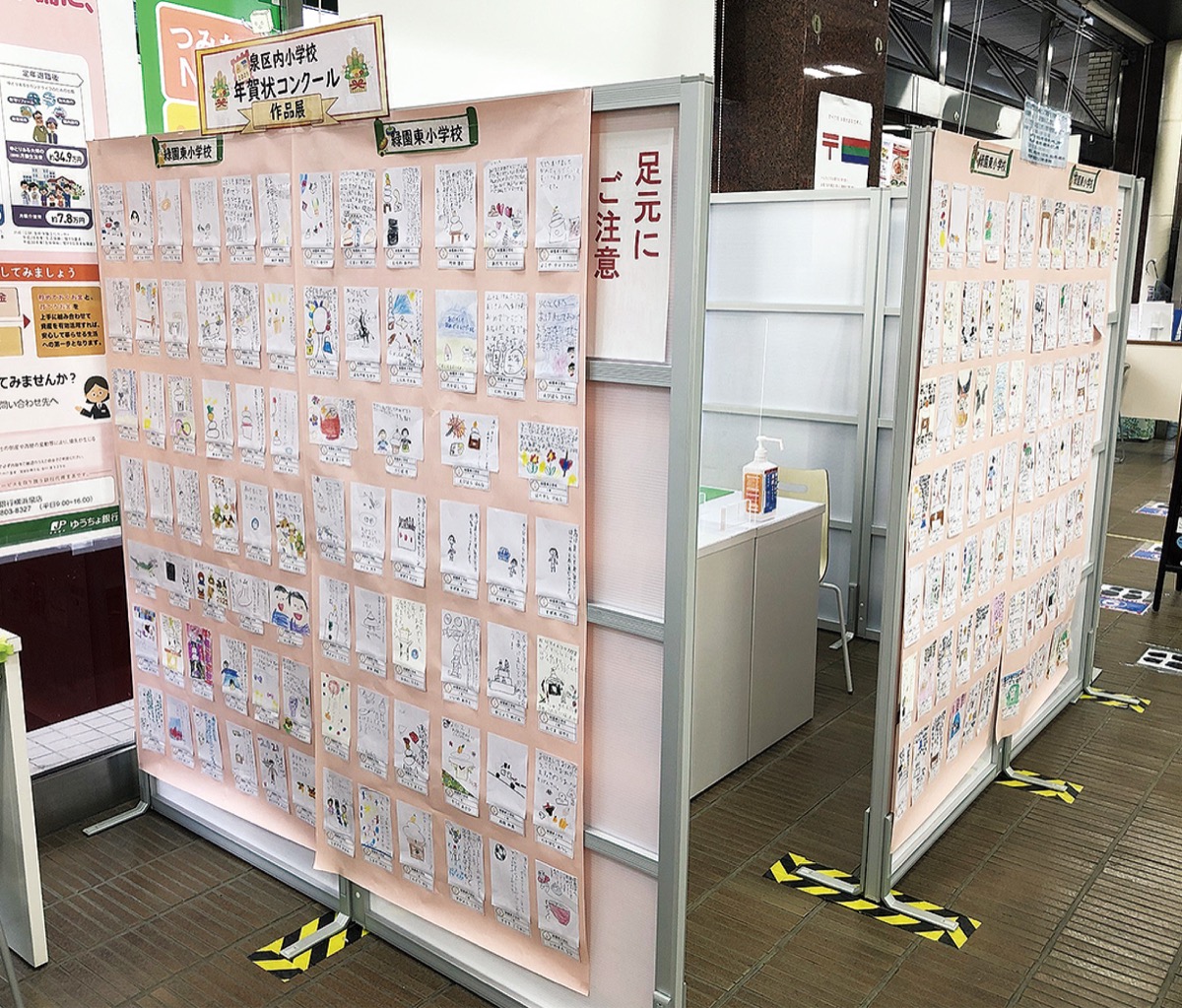 コロナ禍におけるコミュニケーションツールとしての手紙やはがきの魅力を改めて伝えるために例年通り企画された同展。昨年12月に募集を開始し、全16校の1年生から6年生まで合わせて1114枚の応募があった。8校ずつに分け、それぞれ2週間ごとに展示される。