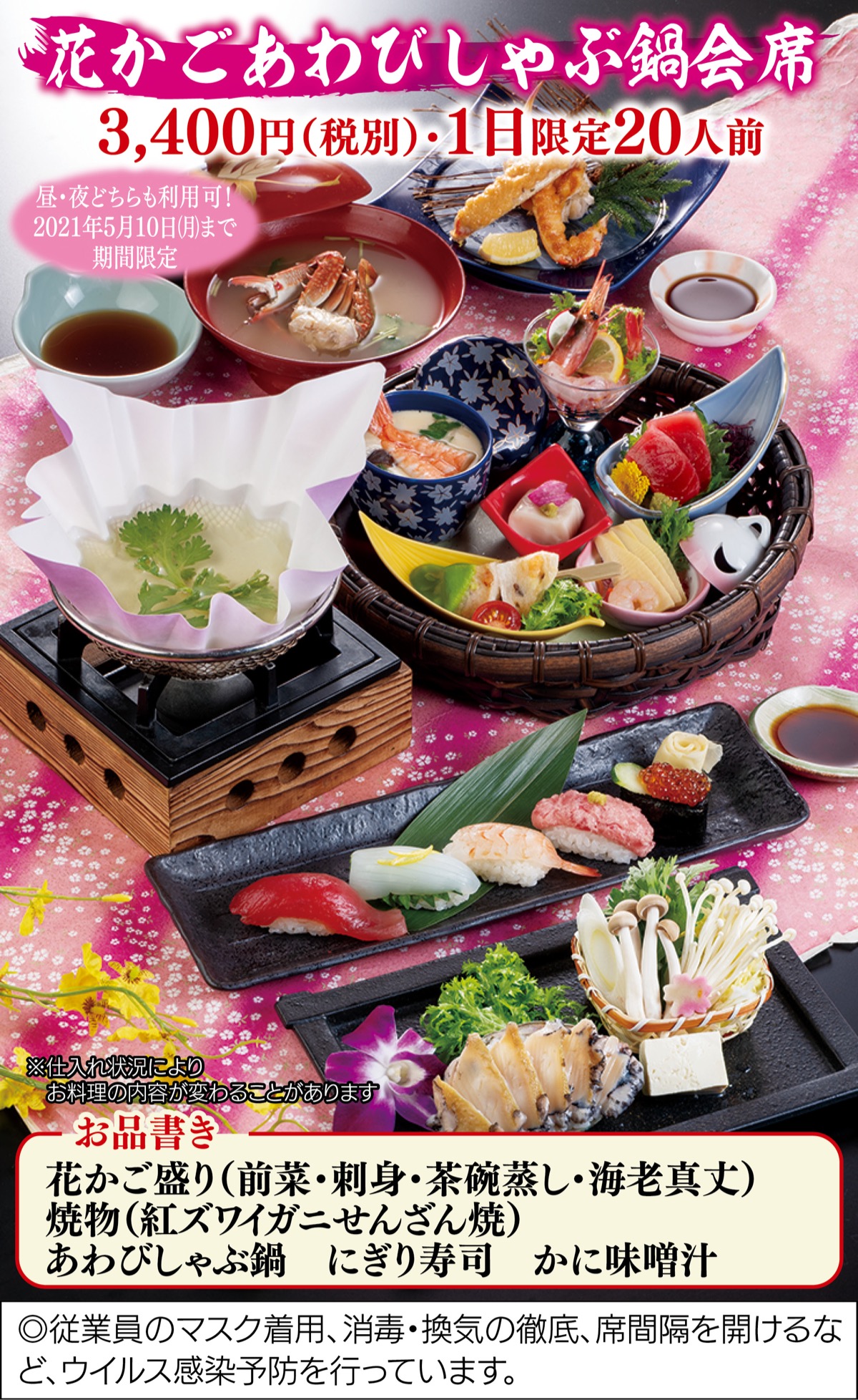 海鮮茶屋せんざんでは、旬の食材を使用した豪華な「花かごあわびしゃぶ鍋会席」が登場。通常5千円相当のところ、なんと3400円(税別)で提供されている(1日20人限定)。