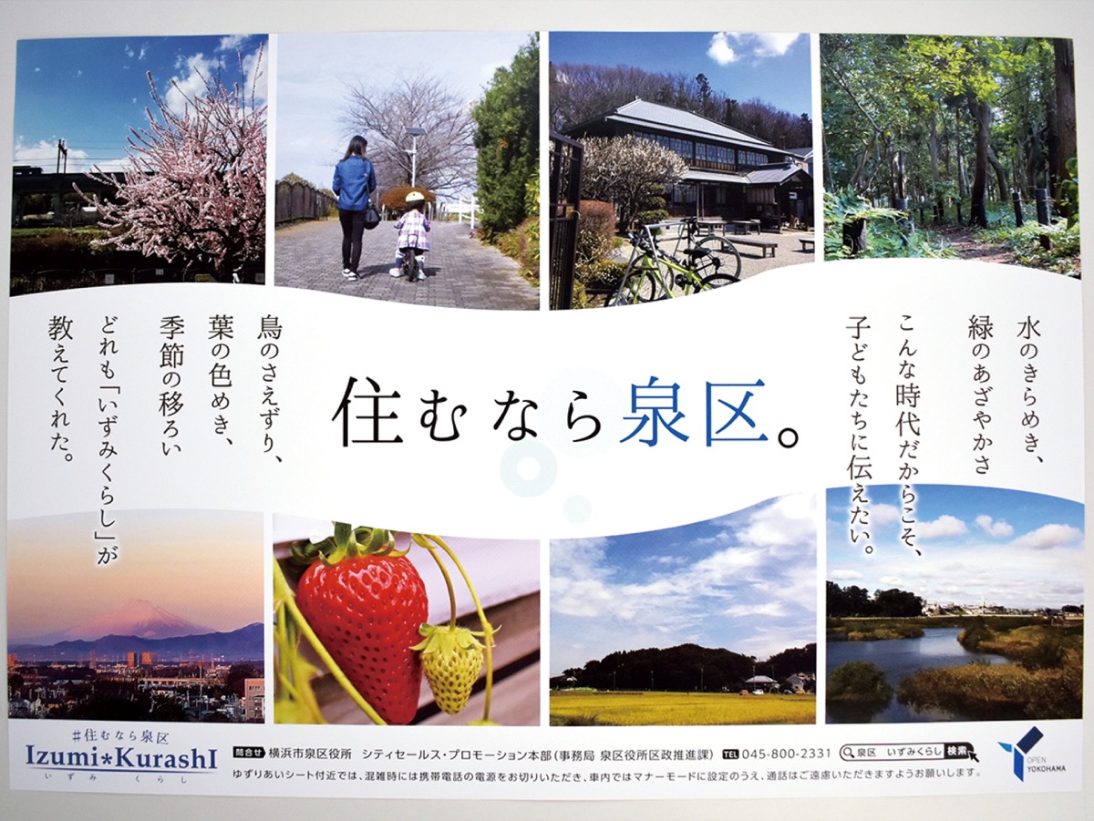 まるでマンション販売のチラシに書かれていそうなこのフレーズは、泉区役所が4月上旬から掲出している交通広告の一節。これは区内4つの課の職員が横断的に集められ、広報活動を行っている「シティセールス・プロモーション本部」が製作したものだ。