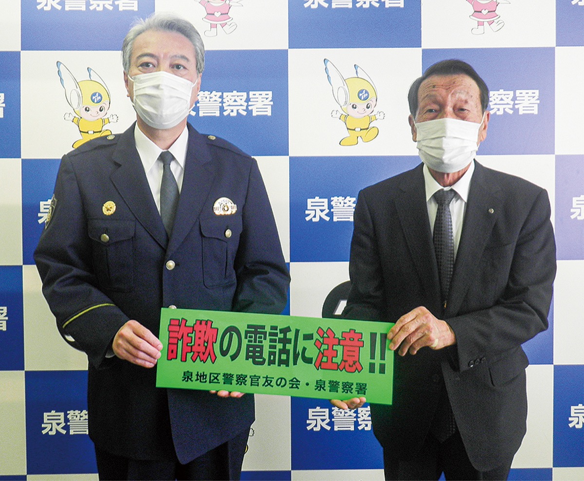泉地区警察官友の会(大貫芳夫会長)が4月22日、泉警察署(柴田直樹署長)を訪問し、特殊詐欺被害防止を呼びかけるステッカーを20枚寄贈した。