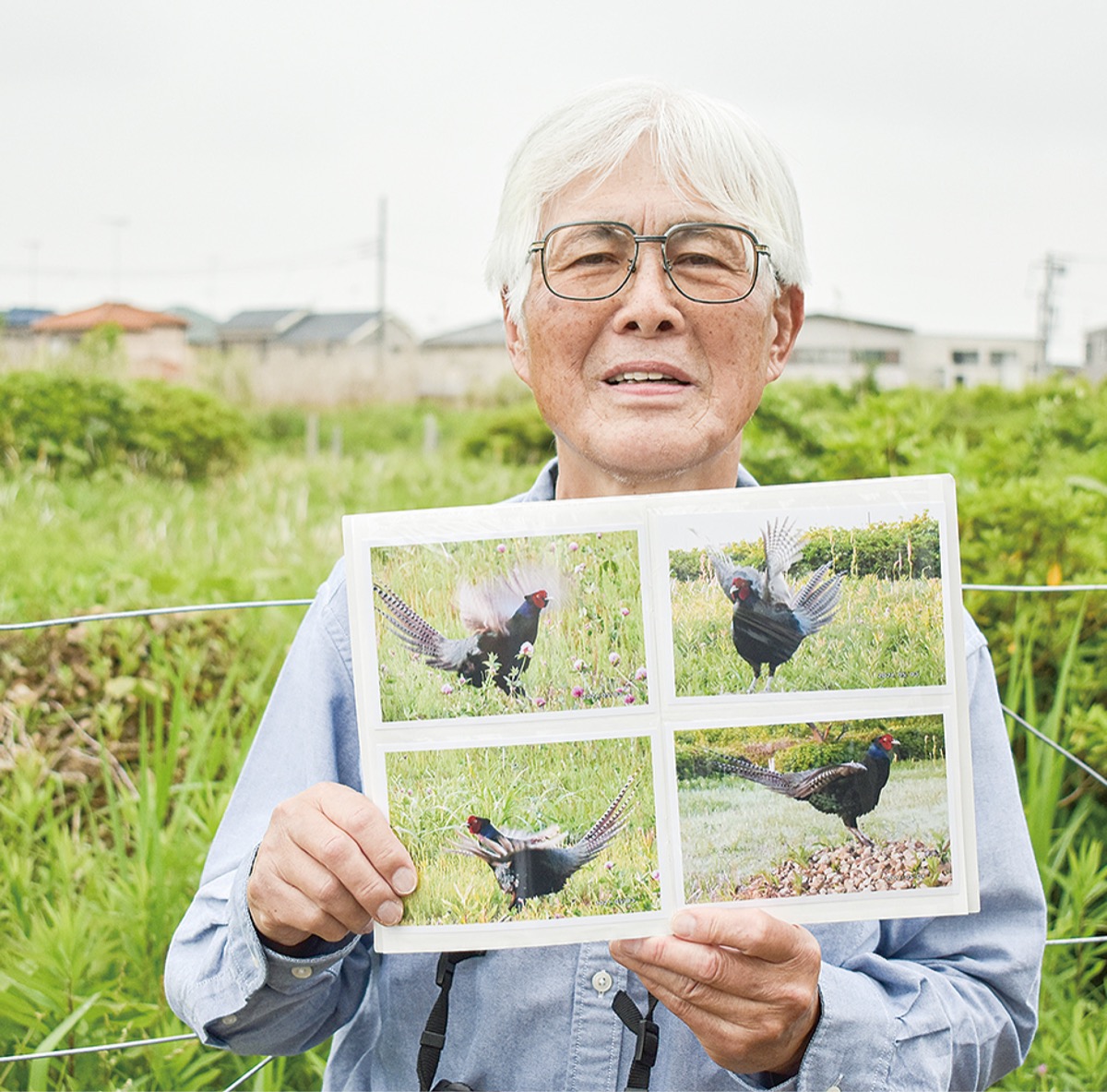 阿部さんの朝は早い。早朝4時半には家を出ると、5時過ぎには一眼レフやコンパクトデジカメを構え、レンズ越しにキジの姿を捉える。