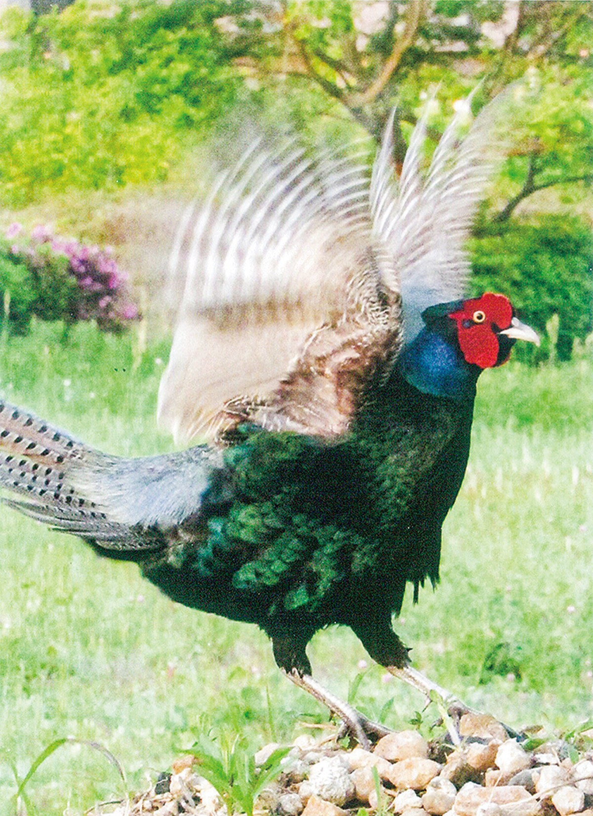 お目当ては「母衣打(ほろう)ち」と呼ばれる、両翼をバタバタと勢いよく羽ばたかせる仕草。「『ケーンケン』と鳴いたら母衣打ちの合図」と数メートル越しに連写で撮影する。まさに「キジも鳴かずば撮られまい」といったところか。