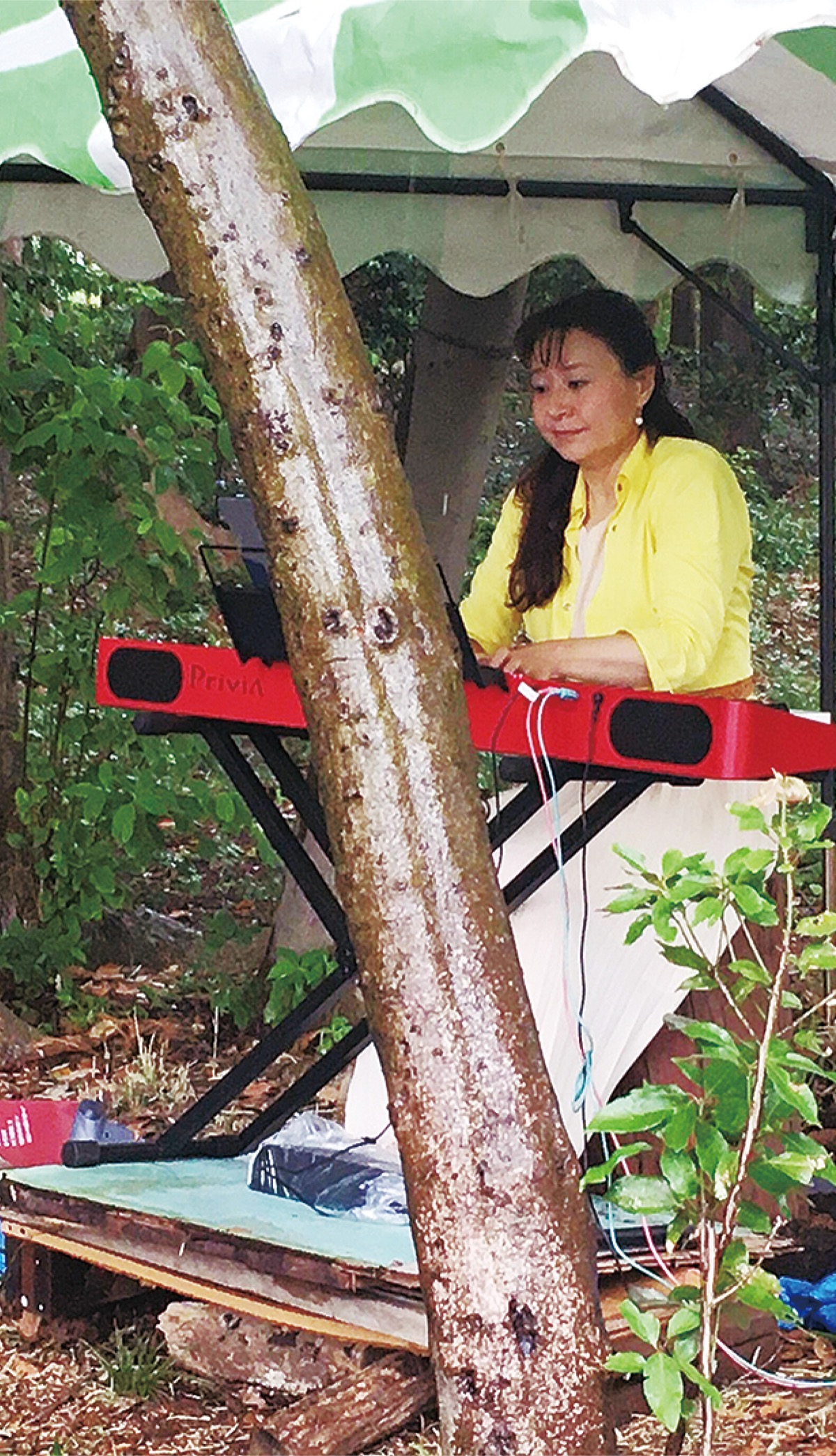 2週間に一度のペースで開催し、地域の住民70〜80人が来場。屋外のためピアノではなくキーボード、譜面も風に飛ばされないようタブレット端末を使う。6月に実施した2回目は雨の中の開催となったが、観客も傘を差しながら演奏と雨音の協演を楽しんだ。