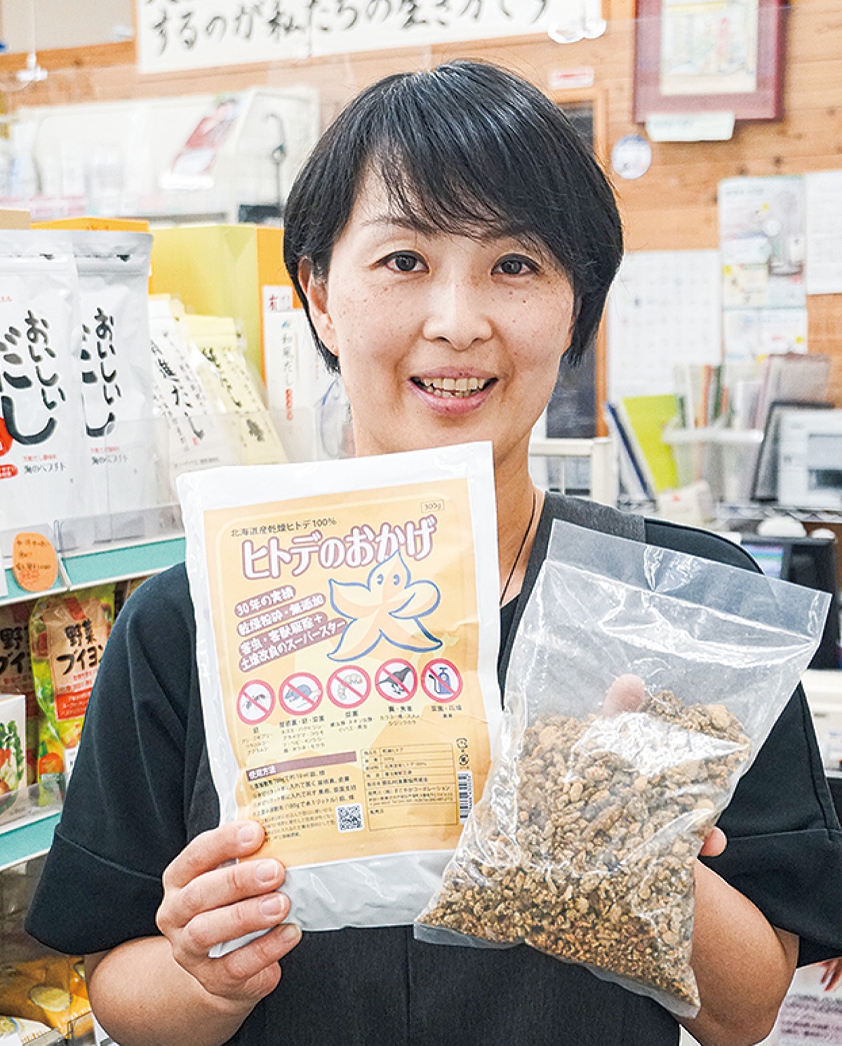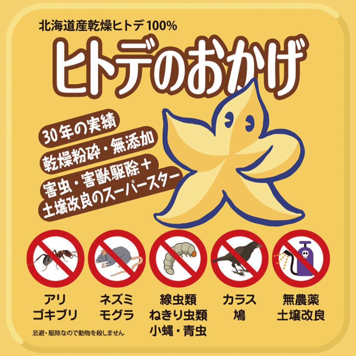 北海道産の乾燥ヒトデを100%使用したこの商品が生まれた背景は、国内有数のホタテ産地である日本最北の村「猿払(さるふつ)村」にある。ホタテの天敵であるヒトデは、古くから虫や動物を忌避するとして、同村では駆除したヒトデを堆肥として扱ってきた。旭川の有機農業研究家の弓山孝夫さんは、40年前からこの効果に着目し、漁協で作られる乾燥ヒトデを全道の農家に普及したという。
