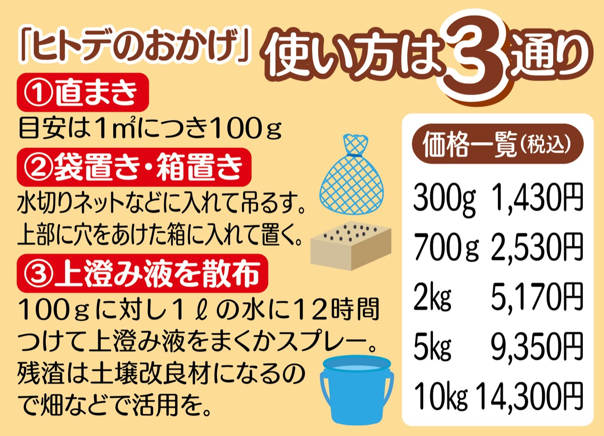 同店創業者の故郷の縁で弓山さんから全国発売を託された「ヒトデのおかげ」は、殺虫剤や刺激の強い忌避剤とは違い、様々な用途で使える。庭やベランダ、屋根裏、物置でゴキブリやねずみ、野良猫対策に。畑ではアブラムシやアリにも効果的。街ではゴミ集積所のカラスや駅周辺のハトのフン害にも活用される。