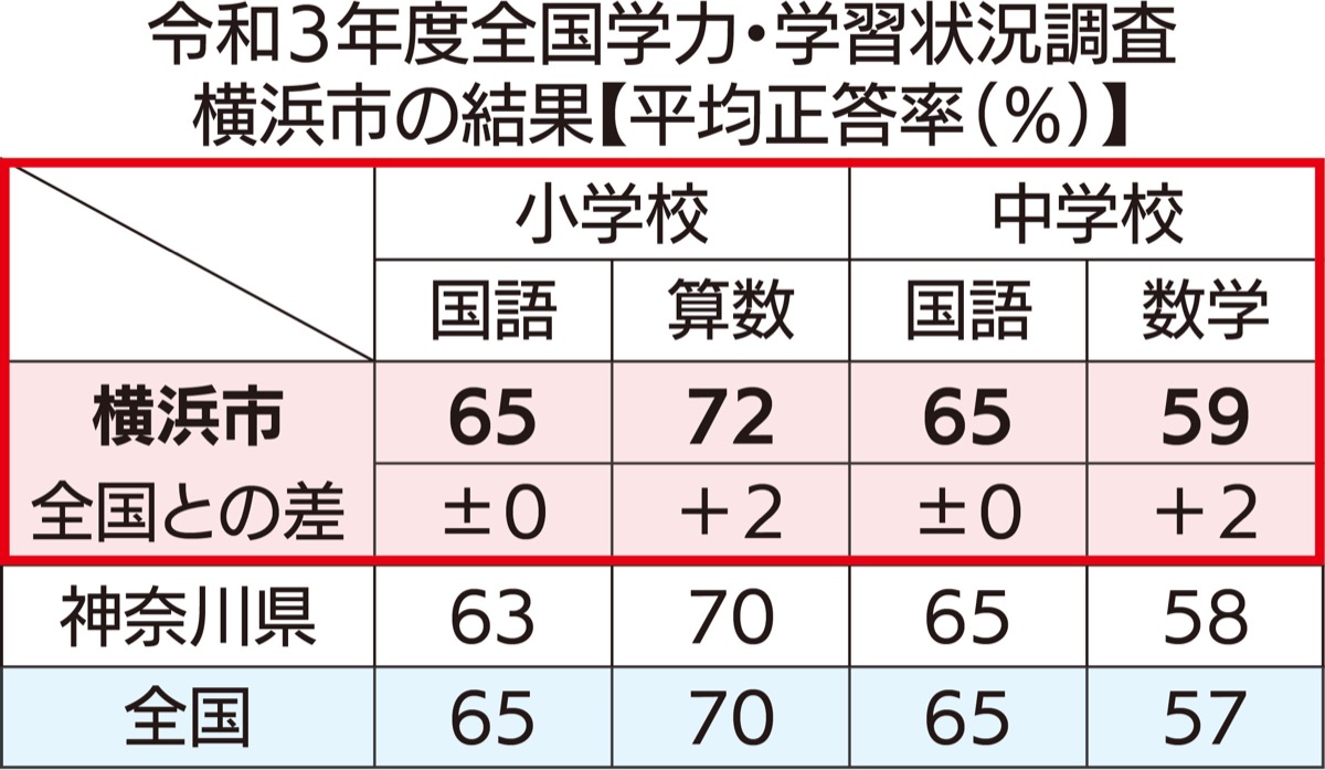 「令和3年度全国学力・学習状況調査」の市の結果が8月31日に公表され、全国の平均正答率と比較し国語は小中学生ともに同等、算数・数学は小中学生ともに2ポイント高い状況が見られた。